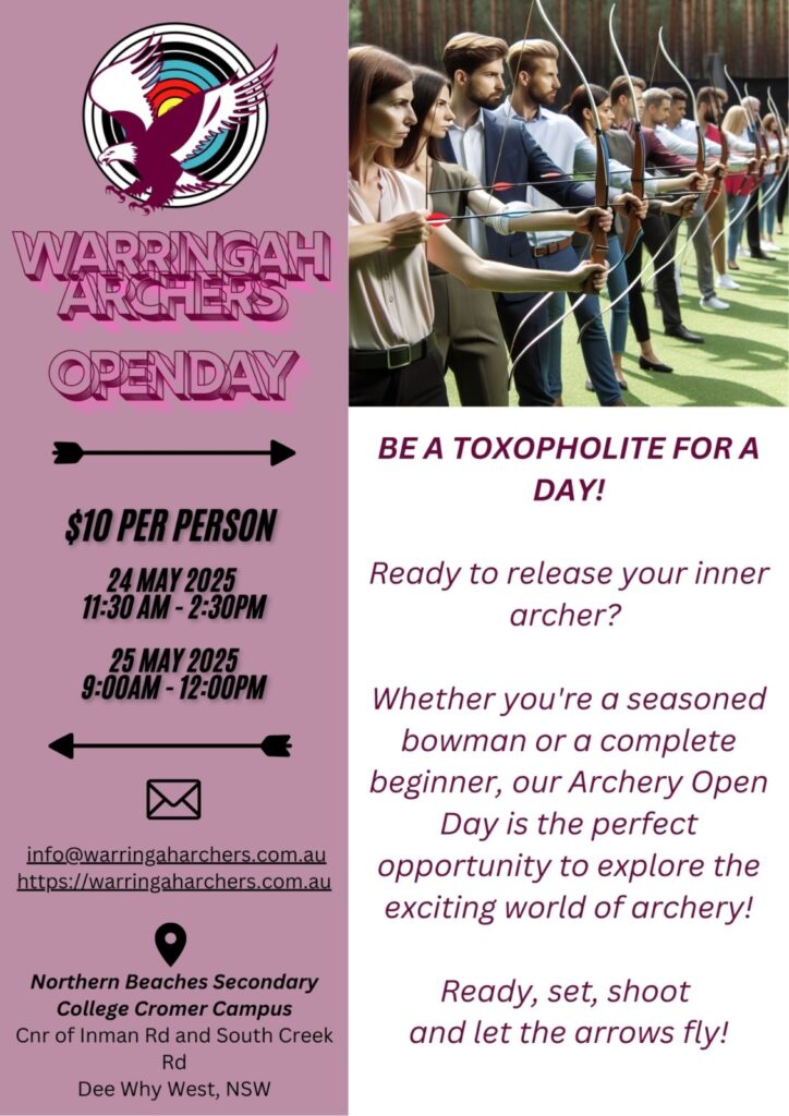 The Warringah Archers 2026 International Women’s Day Event is a registered target shoot offering multiple rounds to suit all experience levels, from beginners through to U17 and senior archers. Distances range from 20m to 50m on 122cm faces, with a maximum of three archers per target. Registration opens at 8:15am, followed by bow inspection at 8:30am, then practice and scoring. Entry is $30 per participant, with online entries only closing on 2 March 2026. Membership will be checked on the day via Archers Diary and digital membership cards, and a canteen will operate throughout the event.